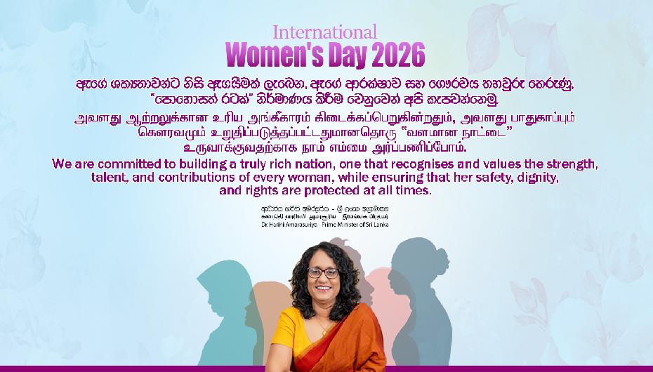 இலங்கைச் சமூகத்தினதும் பொருளாதாரத்தினதும் உண்மையான உயிர்நாடியாக எமது பெண்களே விளங்குகின்றனர். குடும்பத்திலும் சமூகத்திலும் அவர்கள் ஆற்றும் பணி, இன்று ஒரு நாட்டின் எதிர்காலத்தைத் தீர்மானிக்கும் தீர்க்கமான காரணியாக மாறியுள்ளது. எமது அரசாங்கத்தின் "வளமான நாடு - அழகான வாழ்க்கை" கொள்கைப் பிரகடனத்தின் ஊடாக, பெண்களை வெறும் பயனாளிகளாக மாத்திரம் கருதாமல், நாட்டின் அபிவிருத்தியின் செயல்திறன்மிக்க பங்காளிகளாகக் கருதி, அவர்களுக்குரிய கௌரவத்தையும் வாய்ப்புகளையும் வழங்க வேண்டும் என்பதே எமது எதிர்பார்ப்பாகும்.